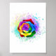 Large, blooming rose with rainbow petals on white background, painted over with splashes of colorful, bright paint. 3d