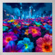 Um vibrante jardim cyberpunk onde flores luminosas se estendem em direção a uma linha de horizonte futurista e nebulosa — uma impressão de arte surreal da natureza urbana com contraste de cores deslumbrantes