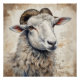 Uma ovelha com lã detalhada e olhos expressivos é retratada contra um fundo macio e turvo. As cores naturais aumentam a aparência semelhante à vida do seu velo encaracolado.