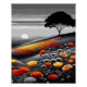 Uma paisagem vibrante do pôr do sol que se estourou com papoilas vermelhas, laranja e ouros contra uma encosta cinza e um céu dramático. Esta impressão de arte combina minimalismo com cor floral ousada, perfeita para decoração moderna ou boho.