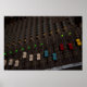 Fotografia aproximada de frascos coloridos num conselho de mistura de estúdio de gravação