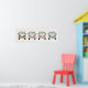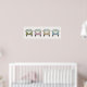 Este divertido cartaz apresenta a vista frontal de quatro combis camper van retro antigas em tons de verde, rosa, amarelo e azul. Um adorável complemento para um berçário.