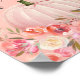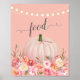 Aproveite este elegante, outono, chá de fraldas floral para uma menina. Pinks, corais e florais amarelos com fundo rosa pincelado. Escrito de "Comida" acima da abóbora. Luzes de cordas no topo e fita cor-de-rosa envoltas em tronco de abóbora.