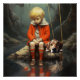 Um menino numa jaqueta vermelha senta-se numa rocha por um corpo de água silencioso e reflexivo, acompanhado pelo seu cão. O garoto parece triste e seu fiel companheiro está se comprometendo com ele. A cena está em uma floresta mística com um ambiente tranquilo. Digital Art Photoshop CS5