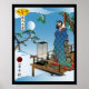 Este elegante trabalho de arte ao estilo impressão de bloco de madeira japonês oferece uma interpretação contemporânea da tradicional arte ukiyo-e, apresentando um gato siamês vestido com um sofisticado quimono azul com intrincados padrões geométricos e florais. A roupa é enfeitada com designs circulares vibrantes e acentuada com detalhes vermelhos ricos, criando um contraste espantoso contra o fundo do céu azul. A cena é colocada em uma varanda de madeira (engawa) com uma tradicional lanterna japonesa em primeiro plano. À distância, o Monte Fuji sobe majesticamente debaixo de uma lua de cheio, enquanto galhos de pínus com agulhas detalhadas se estendem graciosamente através da parte superior da composição. O trabalho de arte captura com mestria a serenidade de uma noite luar no Japão tradicional. A peça inclui elementos ukiyo-e clássicos, como a caixa em forma de ventilador amarela no canto superior esquerdo contendo caracteres japoneses, e um selo circular vermelho com kanji no canto inferior esquerdo. A composição demonstra o equilíbrio característico e a atenção aos detalhes encontrados nos impressões tradicionais japoneses enquanto incorpora elementos modernos caprichosos através do seu felino. A paleta colorida é particularmente refinada, dominada por vários tons de azul tanto no céu quanto no quimono, complementada por castanhos sujos da estrutura de madeira e toques de vermelho nos detalhes da peça. O efeito geral cria uma mistura harmoniosa de técnicas artísticas tradicionais japonesas com sensibilidades contemporâneas, fazer-a uma peça sofisticada e adequada para espaços interiores modernos e tradicionais. Este trabalho de arte consegue colmatar com sucesso a lacuna entre a arte clássica japonesa e a estética moderna, oferecendo uma peça de conversa única que homenageia a tradição ukiyo-e, ao mesmo tempo, apelando aos gostos contemporâneos.