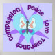 Borboleta na lavanda, roxa, rosa, azul é o centro de um coração azul pálido com um sol lavanda por trás dele e é cercada por "Compaixão, paz, amor, tolerância" em roxo mais escuro.