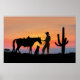 Uma silhueta de um cowboy solitário na pradaria, graças a seus únicos companheiros, um cavalo leal e seu querido cachorro de estimação, tira um momento para mostrar seu afeto e apreciar a beleza de um pôr do sol vermelho.