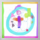 Uma composição abstrato colorida apresenta várias formas, como círculos, triângulos e linhas entremeadas com tons vibrantes de azul, rosa e verde. Os gradientes suaves se misturam com contornos em negrito, criando um padrão dinâmico e caprichoso.