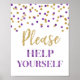 Por favor, sirva-se de sinal para chá de fraldas, chá de panela, festa de aniversário ou casamento em roxo escuro e padrão de confete de ouro. Observe que o efeito de brilho é apenas efeito fotográfico.