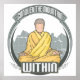 Meditante com fundo de montanha com texto 'conquistar a montanha dentro'. O ioga perfeito e o presente de consciência!
