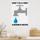 Uma ilustração de uma torneira e uma triste gota de água kawaii azul e uma declaração, "Não seja um gotejamento. Água de conservação"