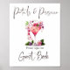 Flores Elegantes de Jardim com Copo de Champanhe, Frutas Vermelhas e texto "Pétalas e Prosecco" Tema Floral Cartaz de Sinalização para Livro de Visitas de Convidados do Chá de Noiva em cores lilás, lavanda, rosa cor-de-rosa, pêssego, damasco e verde.