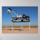 Coober Pedy, a cidade pequena do Outback da Austrália, é a capital opal da pedra angular do mundo. Esta foto-presente de souvenir mostra o sinal de boas-vindas da cidade com um caminhão de sopro de mineração opal.