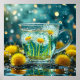 Copo de vidro cheio de água, mostrando vibrantes flores de dente-de-leão brancas com centros amarelos submersas dentro. Ao redor do copo estão dente-de-leões amarelos brilhantes, adicionando ao tema floral. A cena é enriquecida com gotas de água que parecem estar espirrando, criando uma atmosfera dinâmica e animada. O fundo tem um efeito bokeh sonhador e desfocado, com sugestões de cores suaves que aprimoram a estética geral. A composição destaca a beleza da natureza, evocando uma sensação de frescura e tranquilidade.