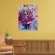Corneta colorida, branca, rosa-rosa engraçada, tocando coruja com uma coruja expressiva e notas musicais alegres, flores, folhas em vermelho vibrante, fúcsia, violeta, roxo, azul, cores brancas, pintura aquarela de Búlgaro Lumini (c)