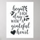 Comece seu dia com uma atitude de gratidão. Nossa poster de tipografia escrita à mão mostra a citação "começar cada dia com um coração grato" em um roteiro de caligrafia escrita à mão macia e escrita à mão, enfeitiçado por supressões e uma ilustração cardíaca.