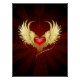 Coração vermelho brilhante de um anjo com asas ouros brilhando no fundo vermelho-radiante escuro decorado com um padrão.