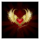 Coração vermelho brilhante de um anjo com asas ouros brilhando no fundo vermelho-radiante escuro decorado com um padrão.