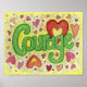 A palavra inspiradora "Coragem" é um verde brilhante contra um amarelo pálido. A palavra é cercada por pêssego flutuante, rosa e corações vermelhos. O trabalho de arte de "Coragem" foi renderizado em multimídia de pastel e aquarela no papel. Trabalho de arte inspiracional de Laurel Latto para DonnaBellas Angels. Personalize esta inspiradora palavra de pintura de arte impressão com sua mensagem ou imagens para fazer presentes personalizados de encorajamento para alguém especial, incluindo mensagens de casamento, aniversário ou formatura. Receitas da venda dessa arte beneficiam os sem fins lucrativos DonnaBellas Angels, cuja missão é fornecer arte inspiradora ao público para o bem-estar mental. O lema da organização é "Medicina cura o corpo, arte cura a alma".