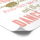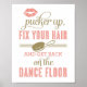 "Pucker Up, conserte seu cabelo e volte para o chão da dança", estilo vintage, poster de casamento para exibir no banheiro feminino. Impressão de pau e sotaques de pincel. Esquema de cor rosa-coral e antigo de cor dourada sobre fundo branco.