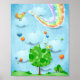 Ilustração surreal com cores do arco-íris, notas musicais, pássaro e árvore grande.