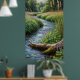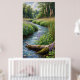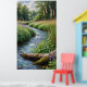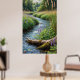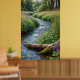 Um córrego florestal tranquilo serpenteia por margens verdejantes, bordeado por taboas e lupinos roxos. A luz do sol filtra através das árvores, criando uma paisagem natural pacífica, ideal para temas de natureza e ar livre.