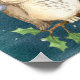Duas corujas bonitinhas de bege castanho com olhos laranja sentados em um galho de árvore marrom com folhas verdes à noite. O fundo é azul escuro com pontos brancos que se parecem com estrelas. As corujas estão se olhando. O da esquerda está vestindo um bereto rosa com pontos vermelhos nele. A coruja à direita está vestindo um chapéu de Santa vermelho e branco.