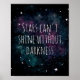 Lembre-se de ser forte e esperançoso com estas belas posters que apresentam uma ilustração em branco, azul e roxo pintada à mão de um belo céu noturno com estrelas. Cada poster também apresenta a citação inspiradora, "Estrelas não brilham sem escuridão" - lembrando-nos que precisamos dos desafios da vida para nos mostrar quem somos e realmente brilhar como seres humanos.