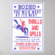 ilustração retrógrada de um Poster mostrando um cowboy americano Rodeo andando de cavalo de boi saltando de lado com as palavras "Rodeo, o oeste selvagem no seu melhor entusiasmo e aventura derramar da vida"