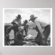 Cowboys a olhar para uma revista intitulada "O Cattleman" na Ranch Pitchfork perto de Meeteetse, Wyoming.