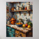 Esta pintura retrata uma cozinha confortável e rústica cheia de vários itens em um arranjo de vida estática. A trabalho de arte é caracterizada por seus pesados impactos na textura, com escovas grossas e expressivas em todas as superfícies, dos armários em apuros às paredes padronizadas. A cena apresenta duas prateleiras de madeira com uma variedade de potes e frascos cerâmicos, enquanto o contador abaixo é adornado com um pote laranja brilhante, uma taça de frutas cítricas e um bule de prata. A pintura evoca uma atmosfera quente e doméstica com um sentimento charmoso e vintage.
