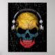 Este design único do artista Jeff Bartels apresenta um crânio escuro de Dj pintado com a bandeira da Colômbia. Fones de ouvido metálicos sentam-se em cima do crânio antigo dando-lhe a aparência de um Dj musical. Grandes fissuras cobra pelo osso que dão ao crânio uma aparência velha e quebrada. O fundo está coberto de arranhões e algemas que podem ser personalizados para qualquer cor que você quiser e dar ao design uma aparência de vintage envelhecida. Este na moda Dj skull design é uma forma excelente de mostrar seu amor pela música e orgulho colombiano.