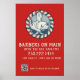 poster de na moda com crachá de barbeiro vermelho branco e azul com estilo retrorreflector em fundo vermelho. Personalize com o nome e os detalhes da barbearia e adicione seu código QR personalizado para seu site ou contas de mídia social.