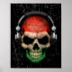 Este design único do artista Jeff Bartels apresenta um crânio escuro de Dj pintado com a bandeira da Hungria. Fones de ouvido metálicos sentam-se em cima do crânio antigo dando-lhe a aparência de um Dj musical. Grandes fissuras cobra pelo osso que dão ao crânio uma aparência velha e quebrada. O fundo está coberto de arranhões e algemas que podem ser personalizados para qualquer cor que você quiser e dar ao design uma aparência de vintage envelhecida. Este na moda Dj skull design é uma forma excelente de mostrar seu amor pela música e orgulho húngaro.