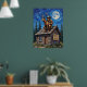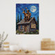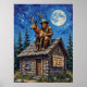 Esta pintura branca apresenta Bigfoot, uma criatura grande e peluda a vestir um chapéu de cowboy e colete, sentado no telhado numa cabana de tronco rústica sob uma lua de cheio brilhante. Ele está suavemente segurando um alce jovem no colo. Todas as árvores verdes cercam a cabine, e o céu noturno é um azul profundo com nuvens e estrelas girando. Um cartaz de madeira anexado à cabine diz, "Pé Grande Também Não Acredita em Você". A trabalho de arte é feita com pinceladas grossas, texturizadas, dando-lhe uma qualidade de sonho e ligeiramente surreal.