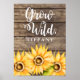 Arte rústica e campestre para berçário ou quarto de criança com girassóis pintados com aquarela em fundo de madeira. O texto diz "Cresça Selvagem" em fonte de letra caprichosa. Personalize este produto adicionando o nome da sua criança.