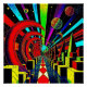 I.A. criada geométrica psicodélica, composição abstrato surreal de globos, crescentes, cubos, planetas, órbitas, esferas e espirais de diferentes formas e cores em um arranjo que agradava os sentidos do artista.