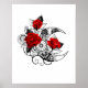 Contorno, lua da crista mecânica com engrenagens, decorada com rosas vermelhas com caules e folhas pretas em fundo branco. Steampunk