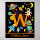 Um fabuloso poster de espaço externo personalizado e colorido para um quarto infantil. Possui astronautas, aliens de foguetes e planetas com um fundo fotográfico de Via Látea. Perfeito para decor de quarto de meninos ou como impressão de viveiro. Personalizar alterando o nome e o inicial.