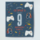 Esta placa design de boas-vindas do aniversário de criança de jogos, legal e moderna, apresenta um design azul de jogos, com um controlador, fone de ouvido, corações de saúde, relâmpagos, moedas e estrelas. O poster pode ser personalizado com seu nome e idade. A decoração temática perfeita para os jogadores para a festa de aniversário infantil.