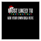 Procurando diversão, esquisito e equipamento de Natal personalizado? Nosso texto de modelo da "Mais Provável" é exatamente o que você precisa! Você pode transferir a design para as camisetas de tendências para canecas de viagem e adesivos, esta coleção é perfeita para mostrar sua única vibração. Toneladas de ideias estão incluídas aqui para fazer seus sumos criativos fluírem. Ideias perfeitas de presente para amigos, família, chefe, colega de trabalho, colega, professor, crianças, adultos, mães, pais e muito mais! Quer você seja "Mais Provável de Chegar Atrasado à Classe", "Mais Provável de Ser Encontrado em Brunch", ou mesmo "Mais Provável de Tirar um Sono em Qualquer Lugar", nós temos o item perfeito para você. Com designs populares como "Mais Provável a Ganhar em Trivia", "Mais Provável a Trazer Snacks", e "Mais Provável de Ir Viral", esta coleção é sobre celebrar os momentos engraçados e relacionáveis que fazem de você, bem... você! Prepare-se para repor sua personalidade com estilo — não importa aonde você vá! temas mais divertidos do tipo "Mais Provável para Começar uma Festa de Dança", "Mais Provável para Começar a Ordem", "Mais Provável para Ser a Vida da Festa", "Mais Provável para Assistir a uma Série", "Mais Provável para Pegar uma Selfie", "Mais Provável para Esquecer Suas Chaves." Muito Provavelmente para quebrar a canção, "Mais propensa a Vestir pijamas o dia todo", "Mais propensa a ir em uma viagem espontânea," "Mais propensa a dizer uma Piada Pai," "Mais propensa a citar filmes," "Mais propensa a chegar tarde," "Mais propensa a possuir muitas plantas," "Mais propensa a beber Ligue todo o café," "Mais propenso a dormir através do alarme," "Mais propenso a procrastinar," "Mais propenso a fazer overpack", "Mais propenso a ganhar um argumento," "Mais propenso a fazê-lo rir," "Mais propenso a pôr cada cão em pé," "Mais propenso a ficar acordado muito tarde," "Mais propenso a ser o caça de hospedeiro, "Mais propenso a ser perfeccionista."