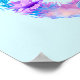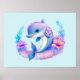 Poster com uma ilustração adorável. Um golfinho azul e roxo cercado por bonito florais submarinos coloridos.