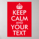 Design seu próprio poster "Mantenha calma e seu texto" com uma cor vermelha brilhante ou outra cor de fundo. Eu sugiro que se você quiser alterar o tamanho do texto que você seleciona todas as camadas dentro do design de texto e altera o design inteiro de uma só vez.