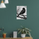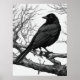Poster in a black-and-white illustration featuring a sleek black crow perched on a gnarled, leafless branch. The bird's detailed feathers contrast sharply with the stark, skeletal tree limbs, creating a dramatic composition.
