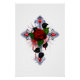 Cruzamento prateado com rosa vermelha e folhas pretas sobre fundo branco.