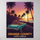 Uma tartaruga vintage, convertível, dirige ao longo de uma estrada costeira com palmeiras durante um pôr do sol vibrante no sul da Califórnia.