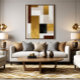 Composição geométrica de cubos ouros e castanhos que se cruzam perfeitamente. A arte minimalista e elegante reflete riqueza e sofisticação, fazer-a uma peça de arte perfeita para ambientes modernos.