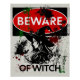 Sinal divertido "Cuidado com a bruxa" com uma bruxa, sangue e matéria verde e negra espalham-se.