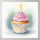 Impressão de arte digital, em estilo aquarela, de um cupcake de aniversário com gelo cor-de-rosa, borrachas coloridas e uma vela acesa. Perfeito para o decor de parede de um comprador de doces ou para uma primeira mesa de buffet de festa de aniversário.
