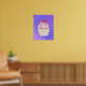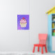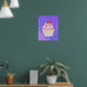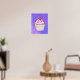 Um poster com uma ilustração de um cupcake delicioso. Glacé rosa e garoa de chocolate. Um cupcake amarelo e uma framboesa no topo. Meu Deus! O fundo é uma textura de abstrato púrpura com pequenos corações espalhados.